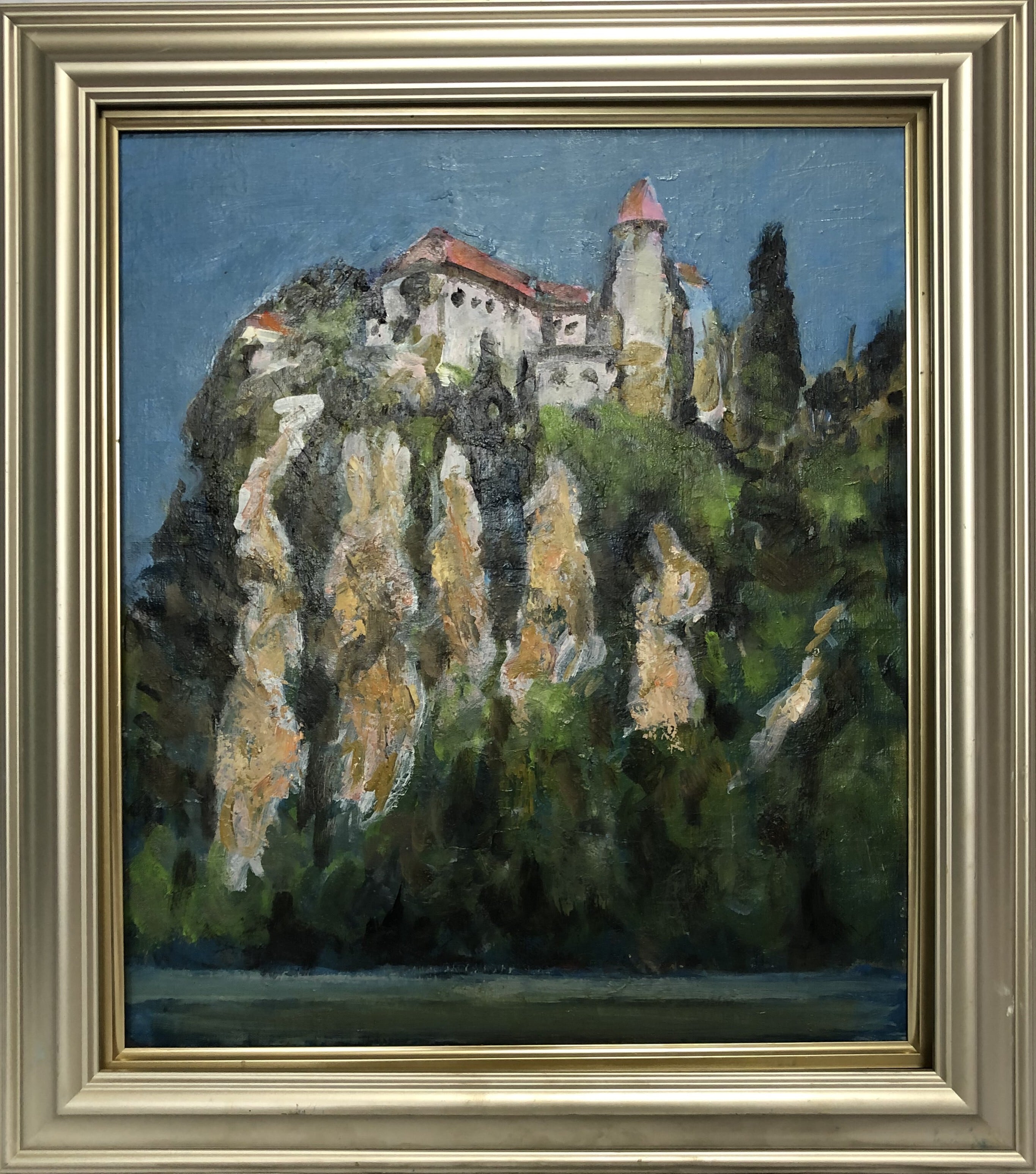 「ブレッド城」は、険しい崖の上にそびえたつ難攻不落の城を描いた油彩画です。この作品には、壮麗なブレッド城の迫力と周囲の自然風景が見事に表現されており、観る人をその荘厳な空間に引き込む力を持っています。まるで城の前に立っているかのような臨場感を感じていただけることでしょう。
